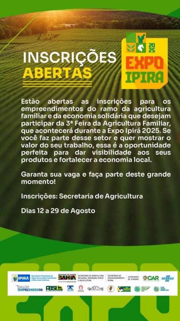 A Prefeitura de Ipirá, por meio da Secretaria de Agricultura, abriu as inscrições para empreendimentos da agricultura familiar e da economia solidária que desejam expor e comercializar seus produtos na 3ª Feira da Agricultura Familiar, evento que integra a programação da Expo Ipirá 2025.