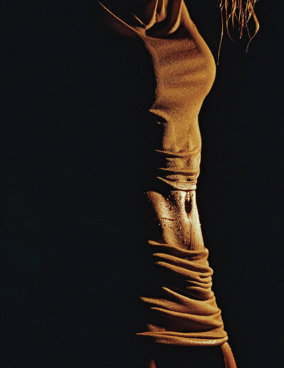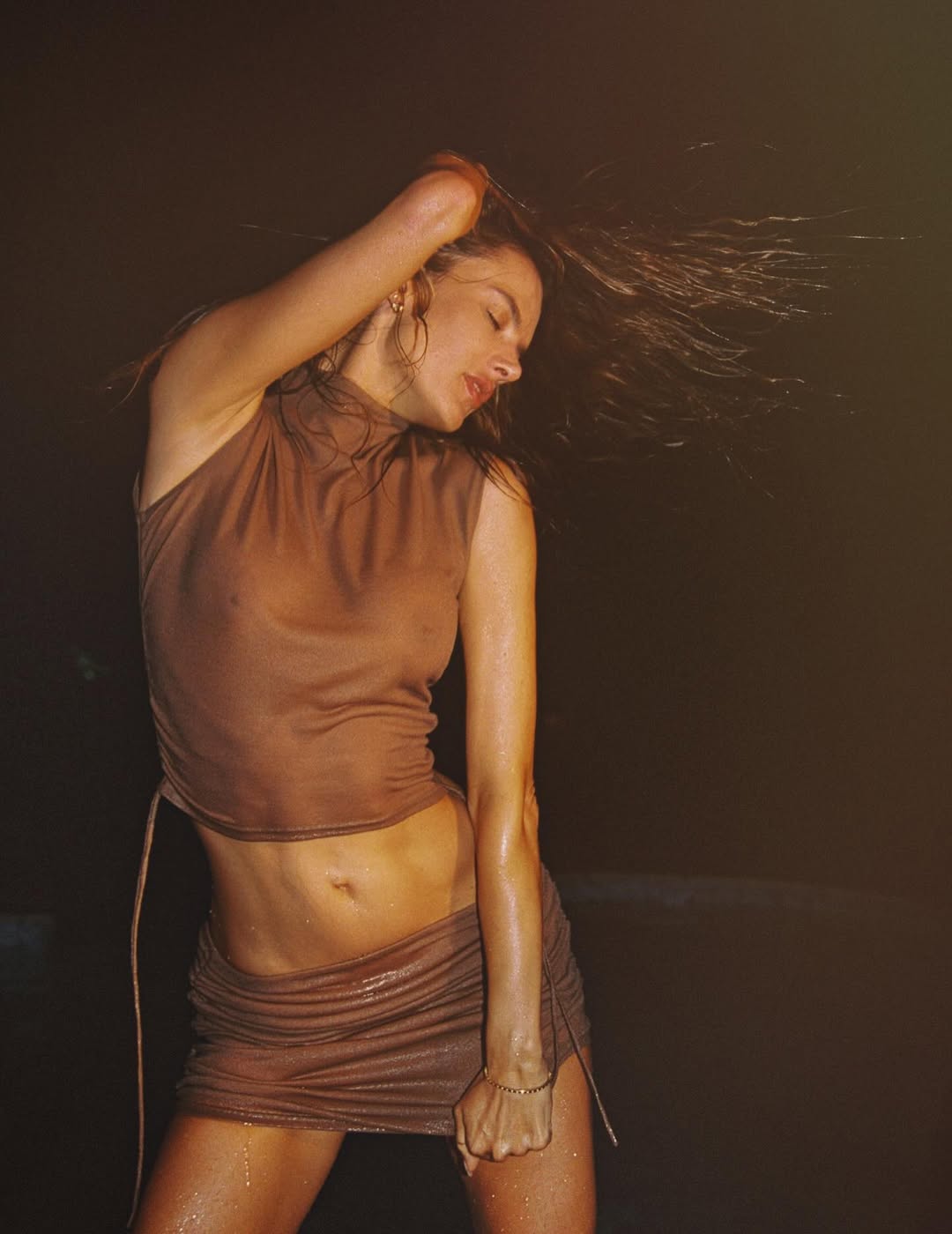 Nas imagens, a brasileira aparece usando um look marrom de tecido transparente. Em um dos cliques, ela surge com a roupa molhada, o que evidencia a transparência da peça — composta por uma blusa justa sem mangas e uma saia curta — e valoriza a silhueta.