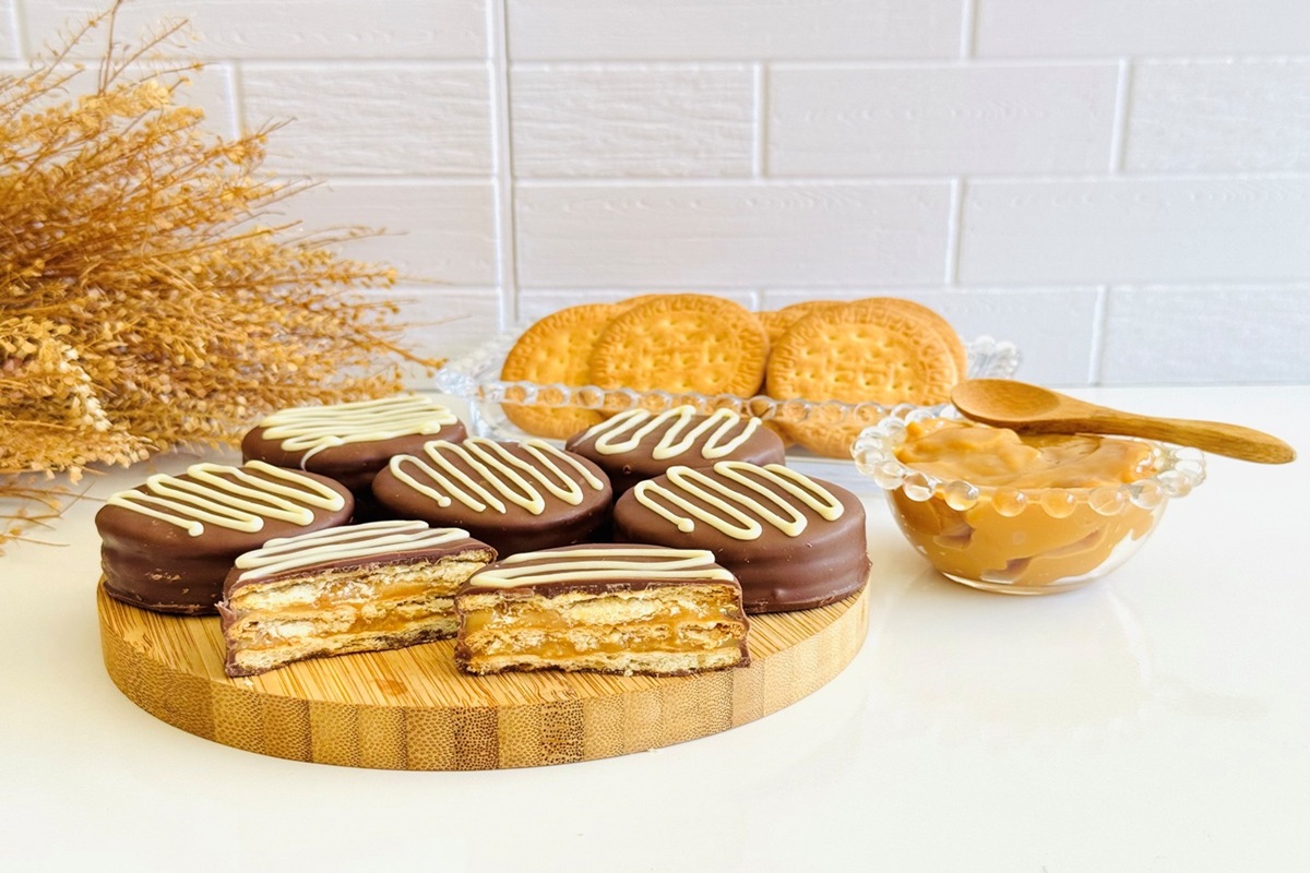 O doce de leite precisa ser firme, em ponto de bico, para não escorrer pelas laterais. Usar saco de confeitar facilita na hora de aplicar o recheio e ajuda a manter o padrão. Ao colocar a bolacha sobre o doce, pressione apenas até o recheio chegar à borda para não quebrar. Levar à geladeira por alguns minutos antes de banhar no chocolate ajuda a manter o formato. Quem não quiser fazer temperagem pode usar cobertura fracionada, que é mais prática. Finalizar com fios de chocolate branco dá um charme especial e valoriza a apresentação.