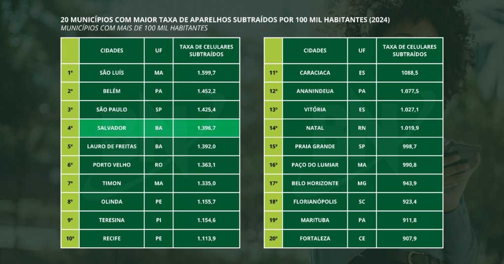 Salvador é a quarta cidade com maior taxa de roubos e furtos de celulares do Brasil em 2024. Conforme dados do Anuário da Segurança Pública divulgados nesta quinta-feira (24), a capital baiana 1396,7 aparelhos subtraídos a cada 100 mil habitantes no ano passado.