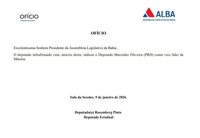 “Excelentíssima Senhora Presidente da Assembleia Legislativa da Bahia. O deputado infrafirmado vem, por meio deste, indicar o Deputado Marcinho Oliveira (PRD) como vice-líder da Maioria”, escreveu Rosemberg Pinto no documento.