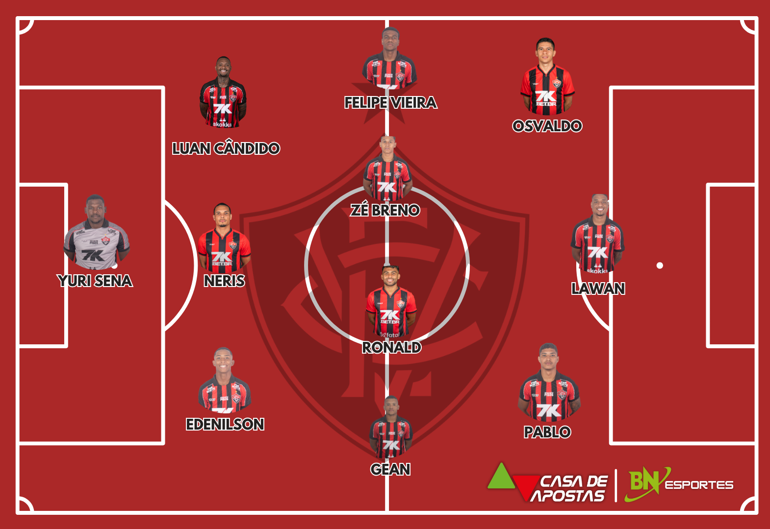 Vitória: Yuri Sena; Edenilson, Neris e Luan Cândido; Gean, Ronald, José Breno e Felipe Vieira; Pablo, Osvaldo e Lawan. Técnico: Rodrigo Chagas.