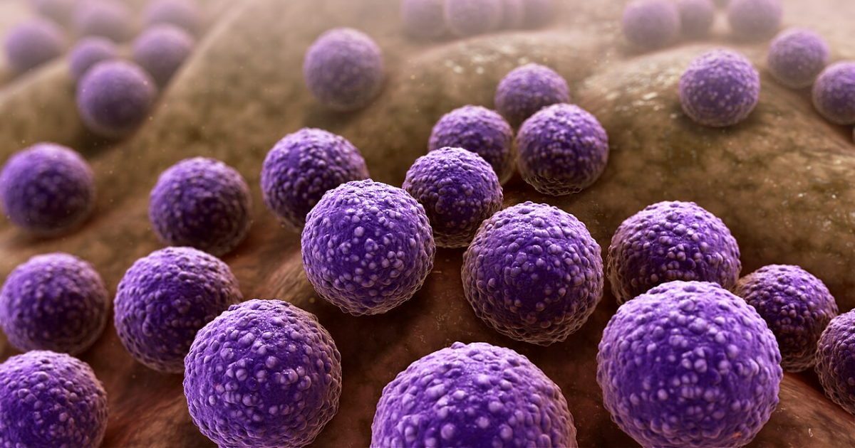 Fonte: Jornal USP / Staphylococcus aureus é uma bactéria gram-positiva, de formato arredondado, capaz de formar biofilmes em sua superfície que aumentam a resistência a medicamentos – Imagem: Scientific Animations/Wikimedia Commons