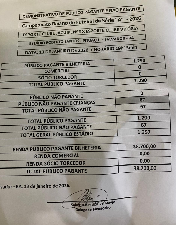 Em duelo realizado nesta terça-feira (13), no Estádio de Pituaçu, Vitória e Jacuipense empataram por 0 a 0. Com mando do Jacuipense, o confronto contou com a presença de 1.357 torcedores no Barradão, resultando em uma renda total de R$ 38.700,00.