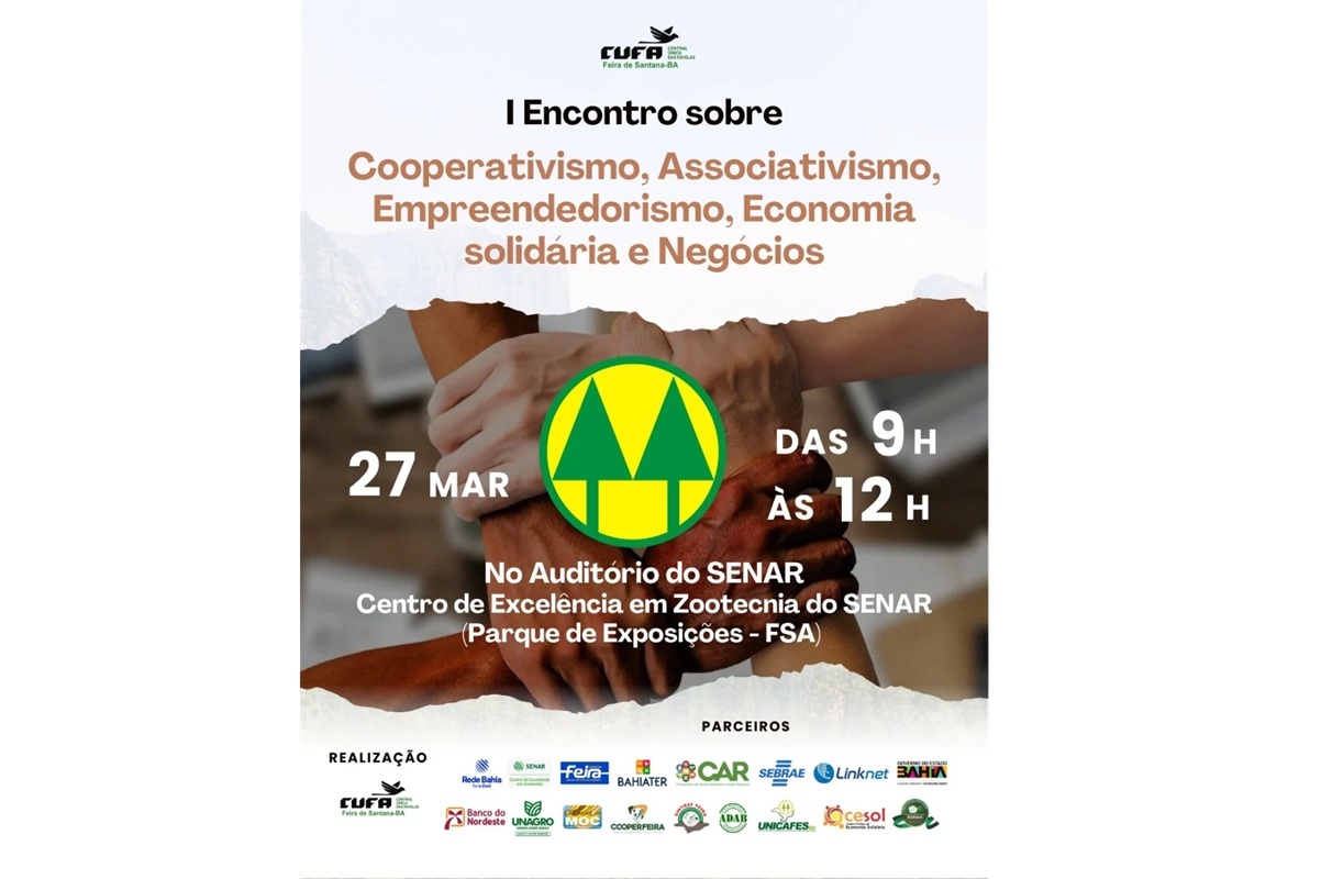 A Central Única das Favelas (CUFA) de Feira de Santana realizará, no próximo dia 27 de março de 2026 (sexta-feira), o I Encontro sobre Cooperativismo, Associativismo, Empreendedorismo, Economia Solidária e Negócios.