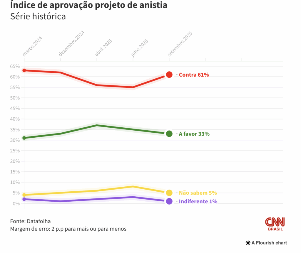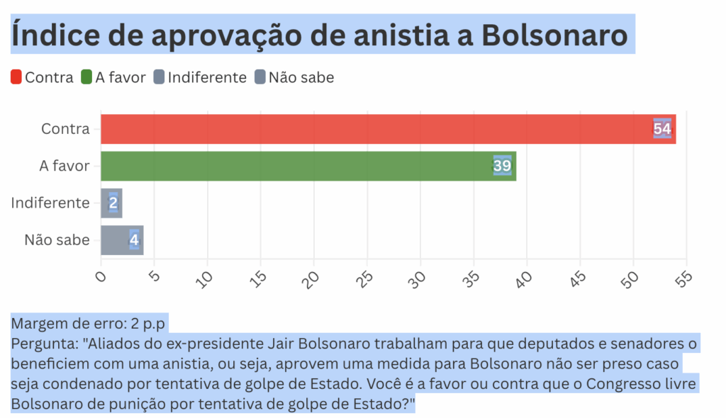 A anistia ao ex-presidente Jair Bolsonaro (PL), preso em regime domiciliar e condenado pelo STF (Supremo Tribunal Federal) a 27 anos e três meses de prisão por tentativa de golpe de estado e outros quatro crimes, é rejeitada pela maior parte da população.