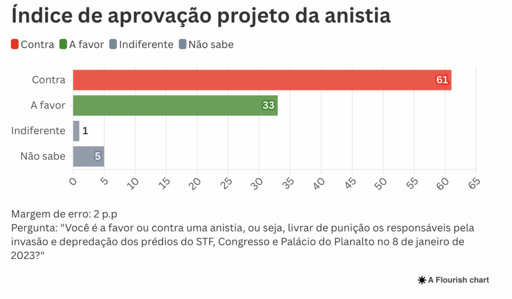 O levantamento também mapeou o índice de aprovação ao projeto da anistia que prevê o perdão a todos os envolvidos nos atos antidemocráticos de 8 de janeiro e vem gerando debate no Congresso Nacional.