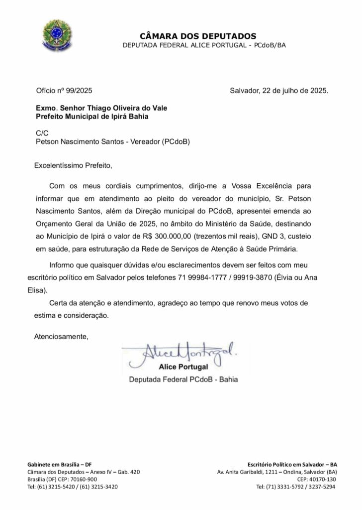 Atendendo ao pleito do vereador Petson Nascimento e da Direção municipal do PCdoB, a deputada Federal Alice Portugal confirma seu compromisso com a cidade de Ipirá e apresentou uma emenda ao Orçamento Geral da União de 2025, no âmbito do Ministério da Saúde, destinando ao Município de Ipirá o valor de R$ 300.000,00 (trezentos mil reais), GND 3, para a Rede de Serviços de Atenção à Saúde Primária do município.