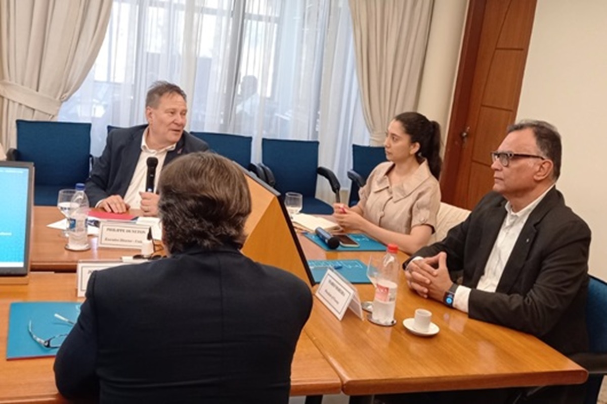 À tarde, Duneton e a oficial responsável de Parcerias no Departamento de Relações Externas e Comunicação da Unitaid, Cíntia Dantas, fizeram uma visita técnica à plataforma de RNA mensageiro (mRNA) em Bio-Manguinhos. Eles acompanharam uma apresentação da infraestrutura, a capacidade instalada, linhas de desenvolvimento e possíveis aplicações.