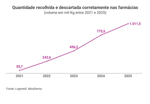 Os dados são da Associação Brasileira de Farmácias e Drogarias (Abrafarma). O volume que passou pela destinação ambientalmente correta em 2025 totalizou 1.011,54 toneladas, soma 18 vezes maior que a quantidade de 55,7 mil quilos descartada em 2021 – período que marcou o início do processo de adequação ao sistema de logística reversa previsto no Decreto Federal 10.388/2020. O contingente também é substancialmente superior ao de 2024, com avanço de 30%.