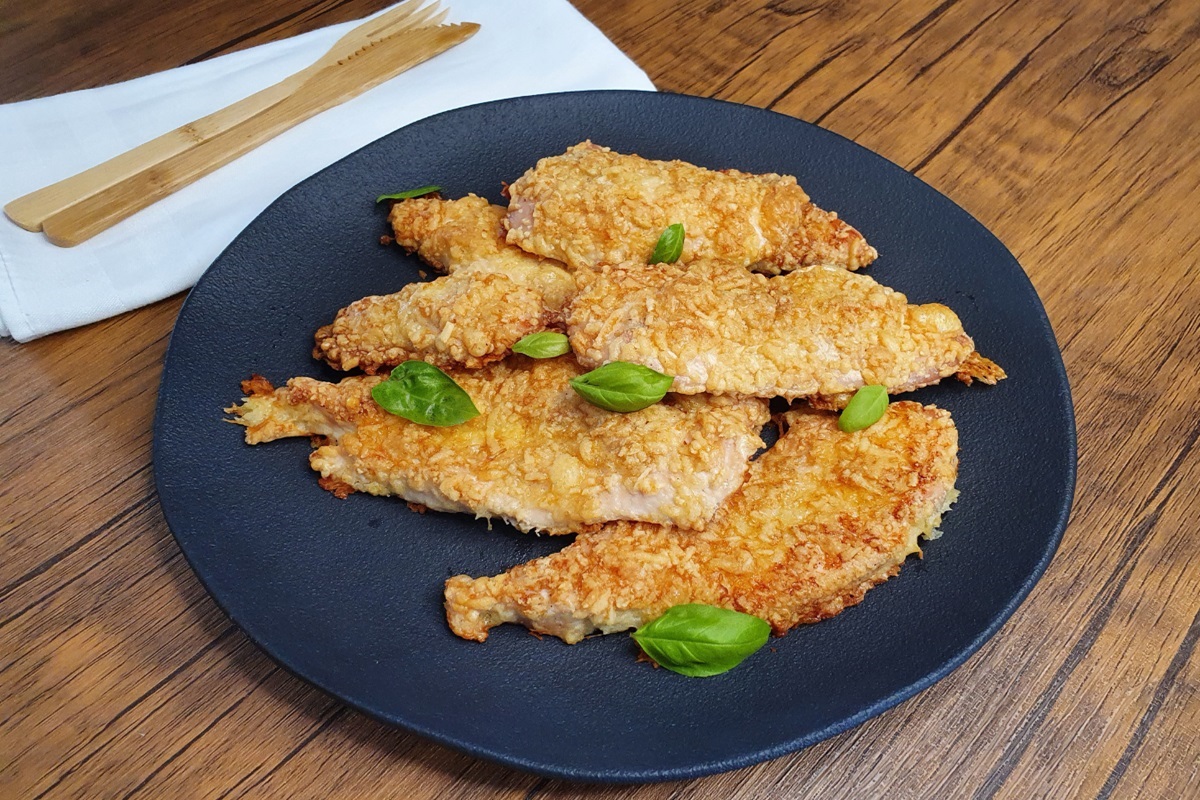 Corte o peito de frango em filés e tempere-os com sal e pimenta;