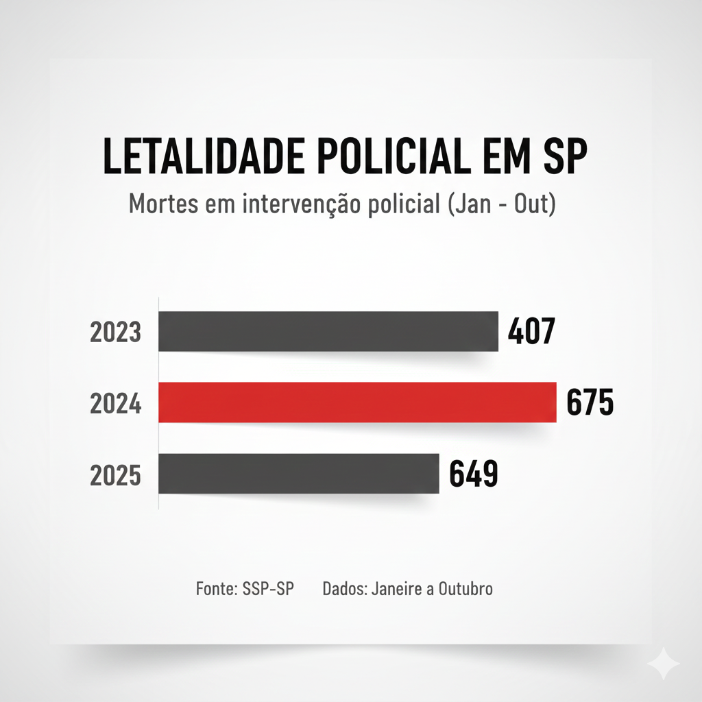 Em um ano marcado por casos recorrentes de violência de gênero, operações na Favela do Moinho, no centro da capital paulista, que deixaram, até o momento, centenas de famílias sem ter para onde ir e pela dispersão do fluxo da chamada Cracolândia, com relatos de truculência policial, as polícias Civil e Militar do Estado de São Paulo mataram 649 pessoas até o final de outubro de 2025.