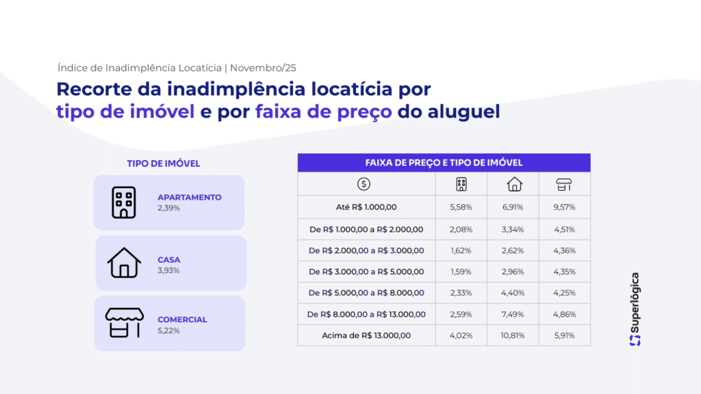 Quando analisado por tipo de imóvel, a inadimplência em apartamentos caiu de 2,49% para 2,39% entre outubro e novembro. Já as casas apresentaram aumento, passando de 3,74% para 3,93%. Nos imóveis comerciais, o índice recuou de 5,45% para 5,22% no período.
