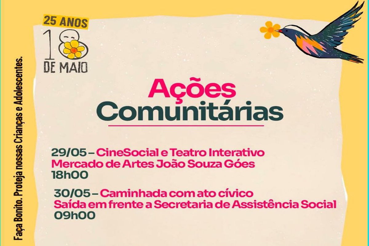 A Prefeitura de Ipirá, por meio da Secretaria Municipal de Assistência Social, promove nos dias 29 e 30 de maio uma série de ações comunitárias em referência ao 18 de Maio, data nacional de combate ao abuso e à exploração sexual de crianças e adolescentes.