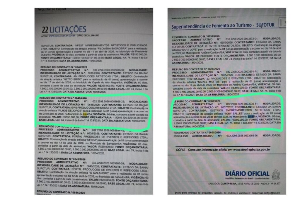 A festa, curiosamente chamada de “micareta” nos documentos oficiais acontecerá nos próximos dias 19 e 20 de abril. Na ocasião a banda Filhos de Jorge receberá o cachê de R$150 mil enquanto que Tony Salles receberá o dobro, R$ 300 mil, chegando ao total de R$450 mil nas transferências do legislador, conforme consta no Diário Oficial do Estado (abaixo).