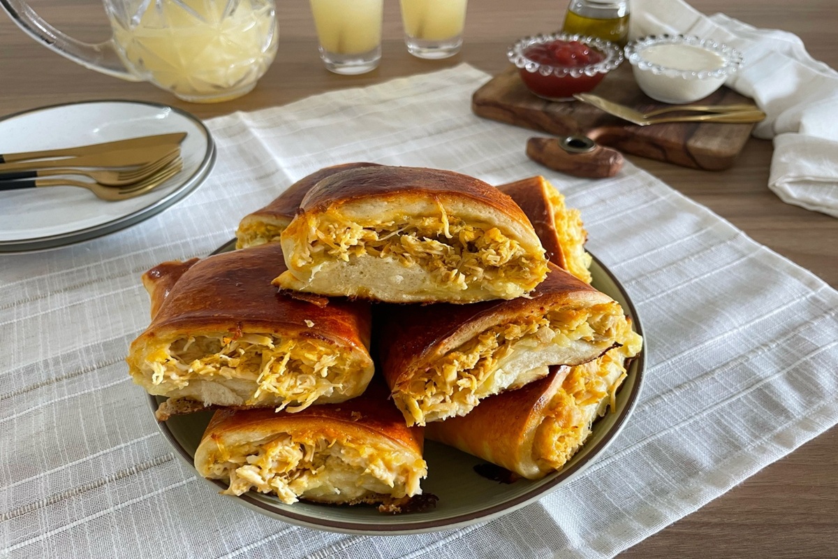 Massa recheada com requeijão, frango e queijo.