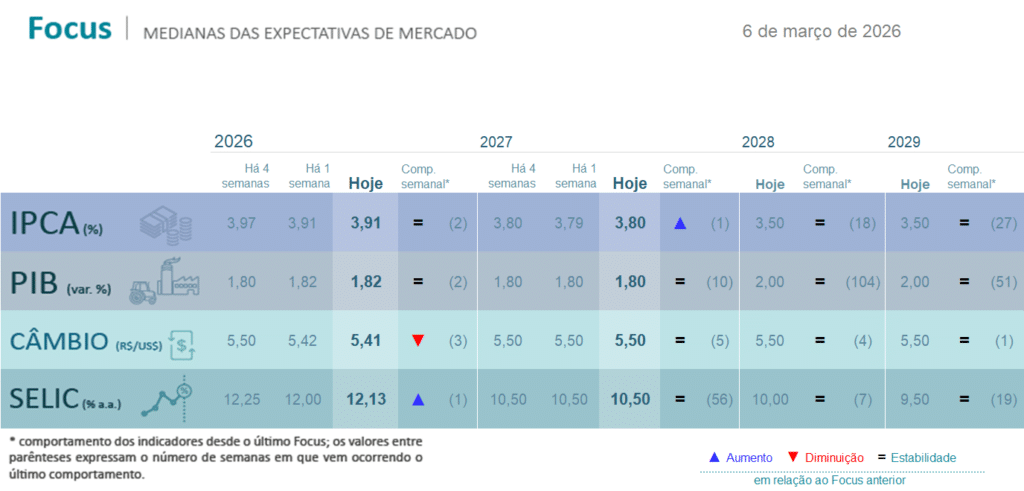A consulta semanal do Banco Central (BC) aos agentes do mercado financeiro sobre expectativas econômicas aponta para estabilidade. A projeção da inflação oficial para 2026 se manteve em em 3,91%, assim como o desempenho do Produto Interno Bruto (PIB), em 1,82%. Todavia, o cenário de instabilidade global com a guerra EUA-Israel-Irã puxou a taxa básica de juros (Selic) para 12,13%, em elevação de 0,13 ponto em relação à consulta anterior. A taxa atual está em 15%. Já o câmbio ficou em R$ 5,41, em relação ao dólar, uma queda de R$ 0,01, em uma percepção de queda que dura três semanas, caindo de R$ 5,50.