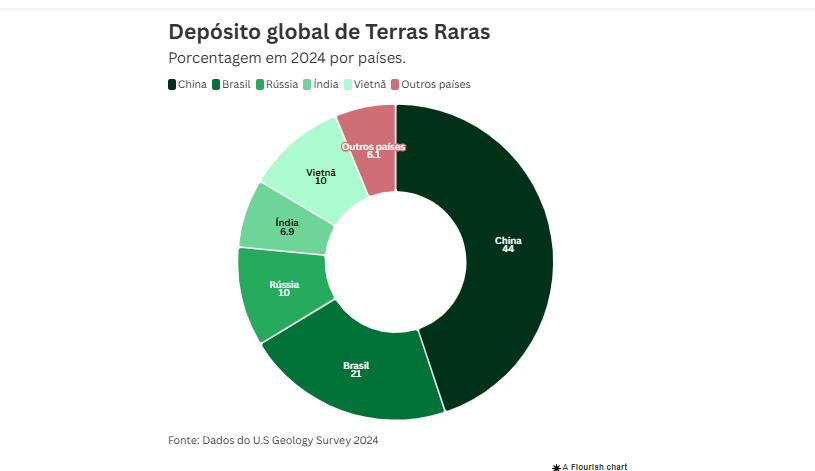 Atualmente, a China domina a produção mundial, com mais de 270 mil toneladas extraídas em 2024, enquanto o Brasil, apesar de ter a segunda maior reserva do mundo, segundo o U.S Geology Survey 2024 (cerca de 21 milhões de toneladas), produziu apenas 20 toneladas no mesmo ano.
