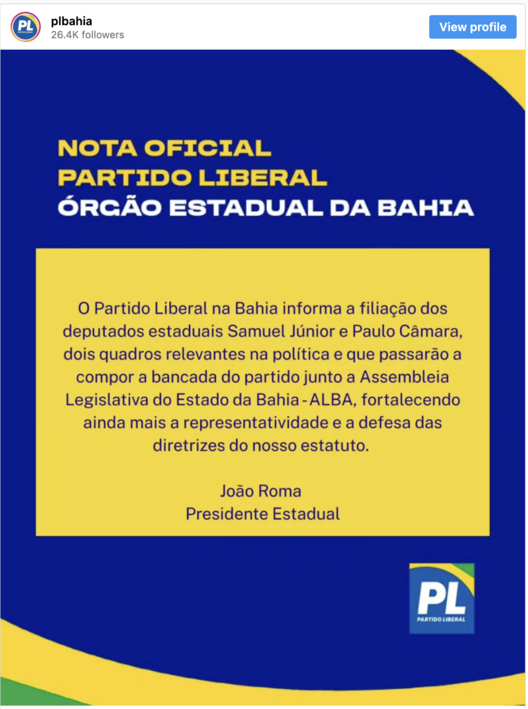 O Partido Liberal da Bahia anunciou, nesta sexta-feira (3), último dia do prazo para a migração partidária antes das eleições, a filiação dos deputados estaduais Samuel Júnior e Paulo Câmara, ex-representantes do Republicanos e PSDB na Assembleia Legislativa da Bahia (AL-BA), respectivamente.