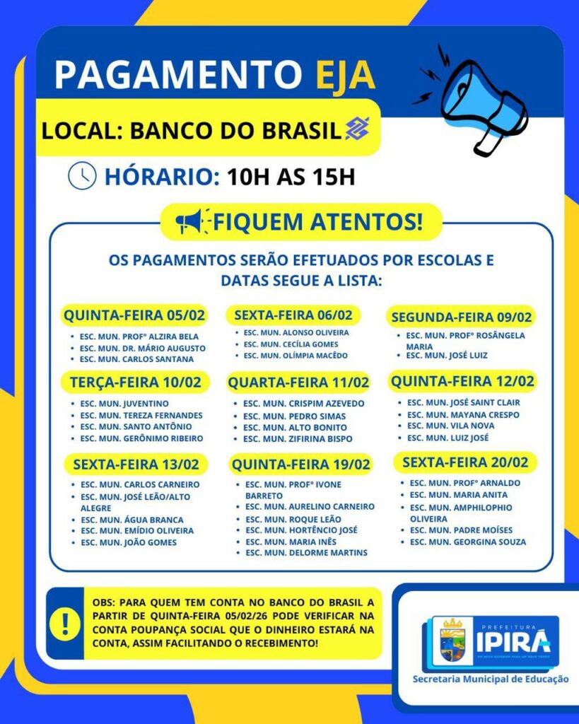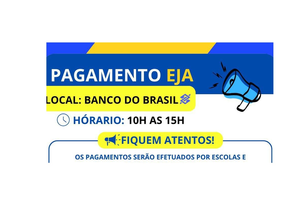 A Secretaria Municipal de Educação informou o cronograma de pagamento do EJA – Educação de Jovens e Adultos, que será realizado no Banco do Brasil, no horário das 10h às 15h, conforme calendário organizado por escolas.