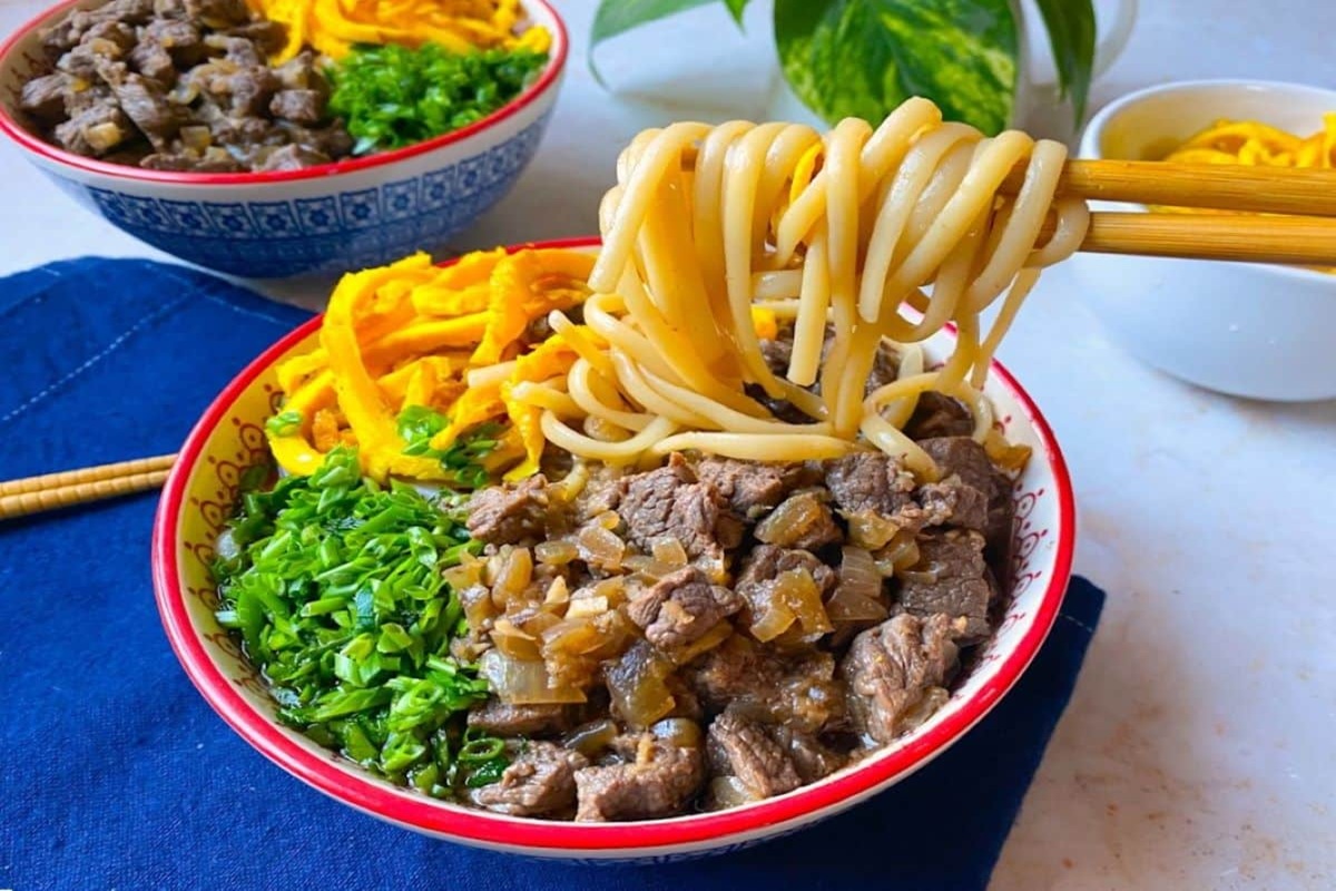 Para servir, coloque em uma tigela o macarrão cozido até que fique próximo à borda, em seguida, disponha a carne sobre metade do macarrão. Complete a outra metade com a omelete picada e a cebolinha. Adicione caldo até encher a tigela e aproveite!