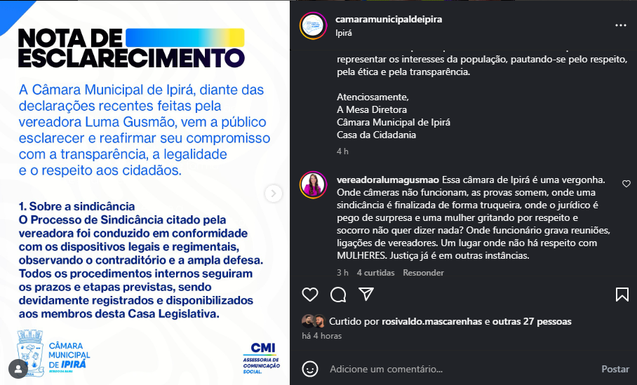 “Essa câmara de Ipirá é uma vergonha. […] Um lugar onde não há respeito com MULHERES. Justiça já é em outras instâncias.”