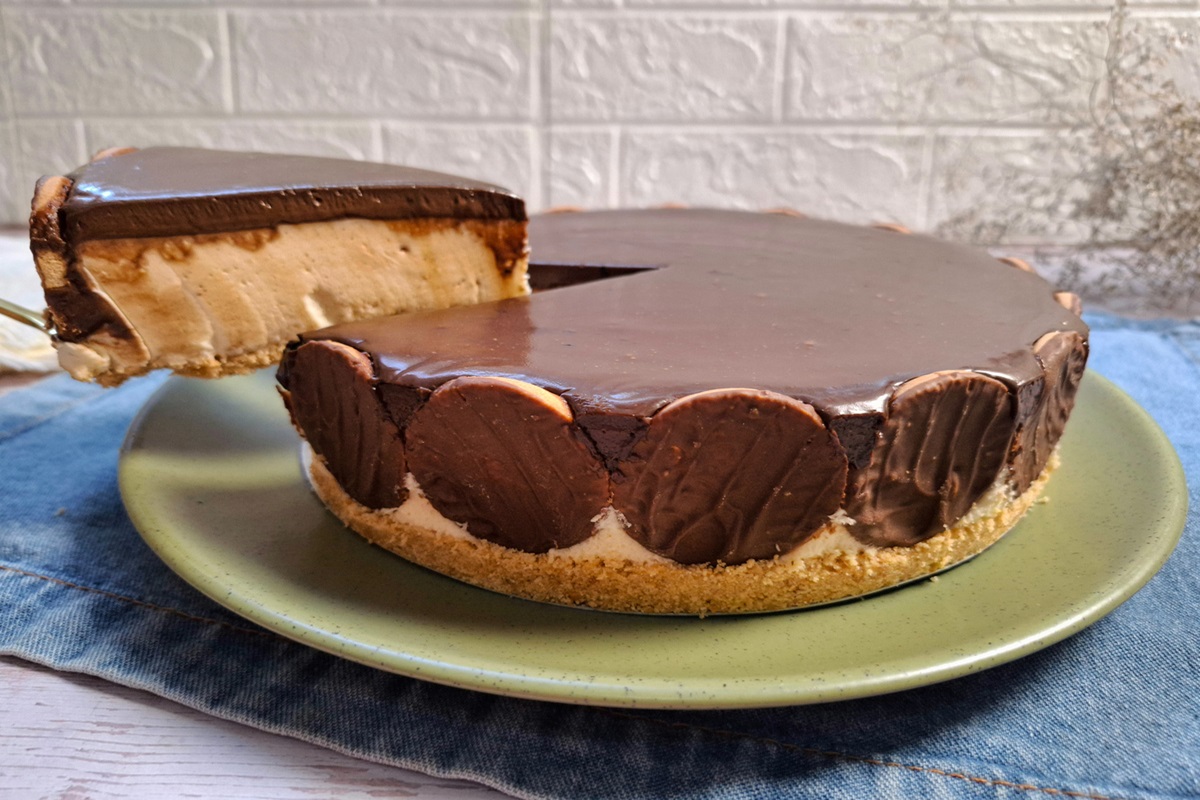Posicione as bolachas com cobertura de chocolate por toda a lateral da forma, com o lado da cobertura para fora. Reserve a forma;