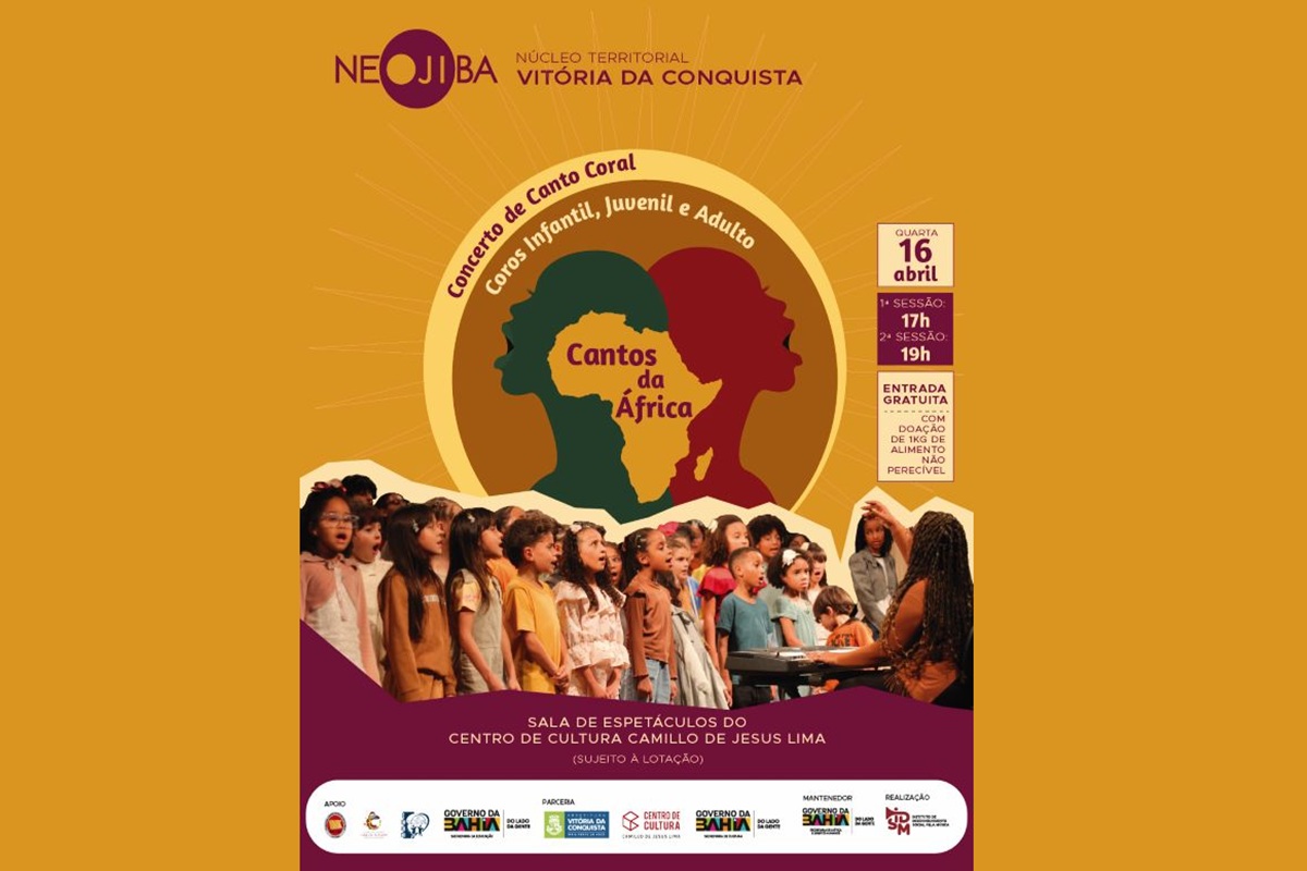 No próximo dia 16 de abril, o Núcleo Territorial NEOJIBA (NTN) de Vitória da Conquista realiza sua primeira apresentação de 2026. O Concerto Cantos da África vai reunir os Coros Infantil, Juvenil e Adulto do programa para uma viagem musical pelo continente africano no palco do Centro de Cultura Camillo de Jesus Lima. O evento contará com duas sessões, às 17h e às 19h.